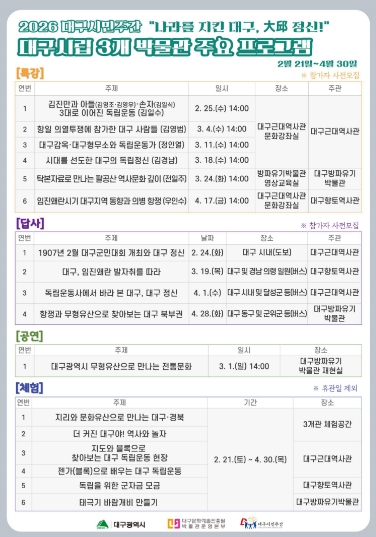 대구시립 3개 박물관에서는 행사 기간 동안 ▲강연(대구 독립운동사 전문가 특강) ▲공연(무형유산 특별공연) ▲체험(3개관 특화 프로그램) ▲답사(역사 현장탐방) 등 입체적인 프로그램을 선보인다.