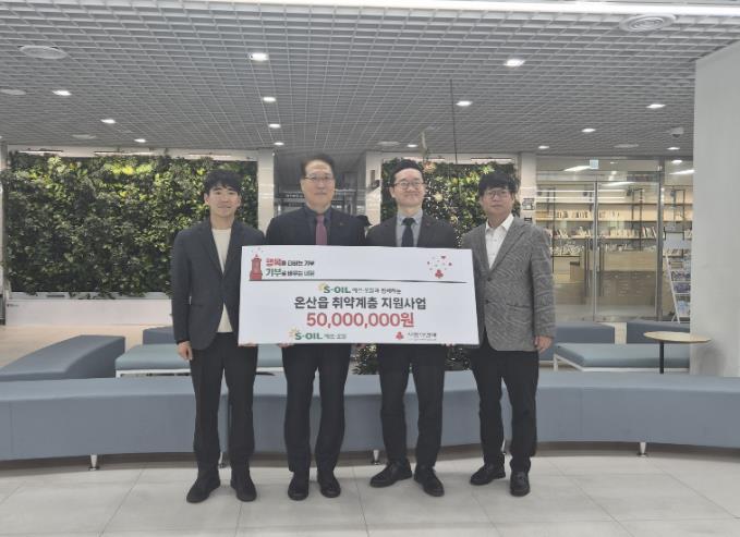 [뉴스앤톡] S-OIL 울산공장이 5일 울주군 온산읍 행정복지센터에서 이준호 온산읍장, 박성훈 S-OIL 상무, 박광철 온산읍 지역사회보장협의체 위원장, 양호영 울산사회복지공동모금회 사무처장 등이 참석한 가운데 온산읍 취약계층 지원금 5천만원을 전달했다.