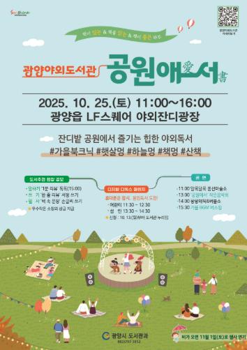 [뉴스앤톡] 광양시는 오는 10월 25일 광양읍 LF스퀘어 잔디밭공원에서 자연과 책이 어우러진 『광양 야외도서관–공원애愛서書』 행사를 연다고 밝혔다.