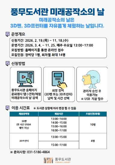 ‘미래공작소의 날’을 통해 풍무도서관에서 보유 중인 3D펜과 3D프린터를 활용하여 설계부터 제작까지 전 과정을 경험할 수 있다. 별도의 교육 프로그램은 운영되지 않으며, 이용자 주도의 자율 체험 형태로 진행된다.
