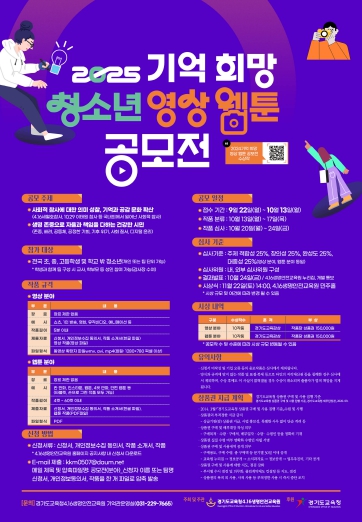 공모 분야는 영상과 웹툰 2개 분야로 전국 초·중·고등학생 및 학교 밖 청소년이면 개인 또는 팀 단위로 누구나 참가할 수 있다.