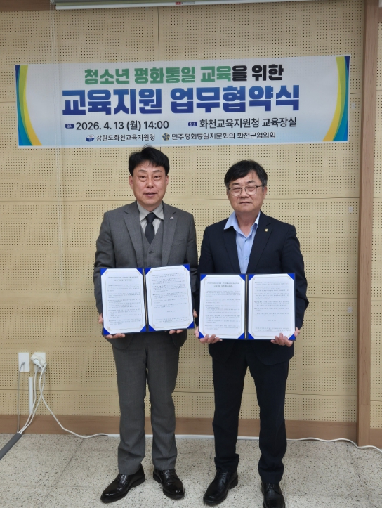 [뉴스앤톡] 강원특별자치도화천교육지원청은 4월 13일 화천교육지원청 교육장실에서 민주평화통일자문회의 화천군협의회와 청소년 평화통일교육을 위한 교육지원 업무협약을 체결했다.