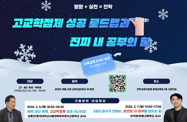 [뉴스앤톡] 전북특별자치도전주교육지원청은 학년 전환기와 대입 제도 전환기를 동시에 맞이한 학생과 학부모의 진로·진학 불안을 해소하고, 고교 생활과 대입 준비 방향 안내를 위해 겨울방학 진학 특강을 운영한다고 13일 밝혔다.
