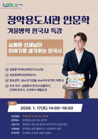 [뉴스앤톡] 남양주시는 오는 17일 오후 2시 정약용도서관 2층 공연장에서 겨울방학 인문학 특강 ‘이야기로 생각하는 한국사’를 개최한다.