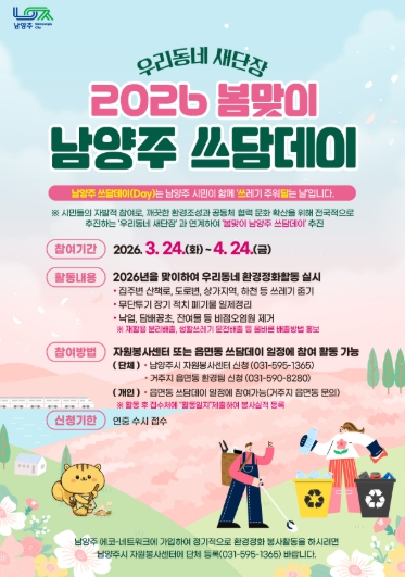 [뉴스앤톡] 남양주시는 3월 24일부터 4월 24일까지 시 전역에서‘우리동네 새단장 봄맞이 남양주 쓰담데이’집중 추진기간을 운영한다고 밝혔다.