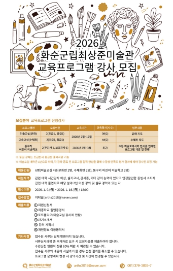 [뉴스앤톡] 화순군은 화순군립최상준미술관(화순읍 동구리에 위치)에서 2026년 미술 교육 프로그램을 함께 운영할 전문 강사를 1월 9일부터 1월 16일까지 모집한다고 밝혔다.