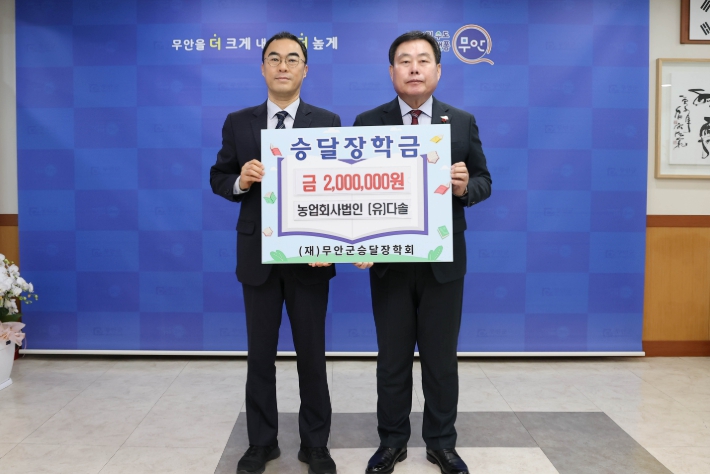 [뉴스앤톡] 무안군은 지난 9일 농업회사법인 유한회사 다솔 김지수 대표가 지역 인재 육성을 위해 (재)무안군승달장학회에 장학금 200만 원을 기탁했다고 밝혔다.