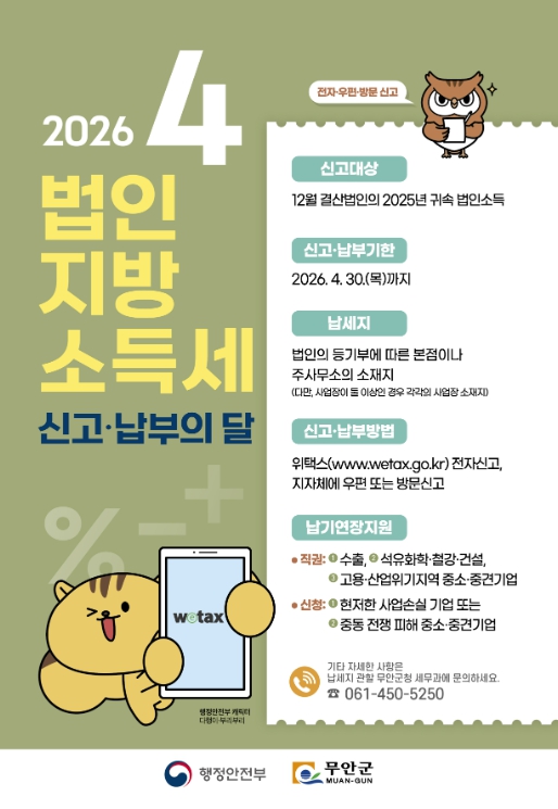 [뉴스앤톡] 전남 무안군은 법인 소득에 대해 지방자치단체에 납부하는 법인지방소득세 신고·납부 기간을 맞아 오는 4월 30일까지 집중신고기간을 운영한다고 밝혔다.
