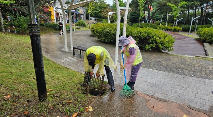 ▲ 지난 25일 공원녹지관리 작업단이 신대 중앙공원 내 배수로 준설작업을 하고 있다
