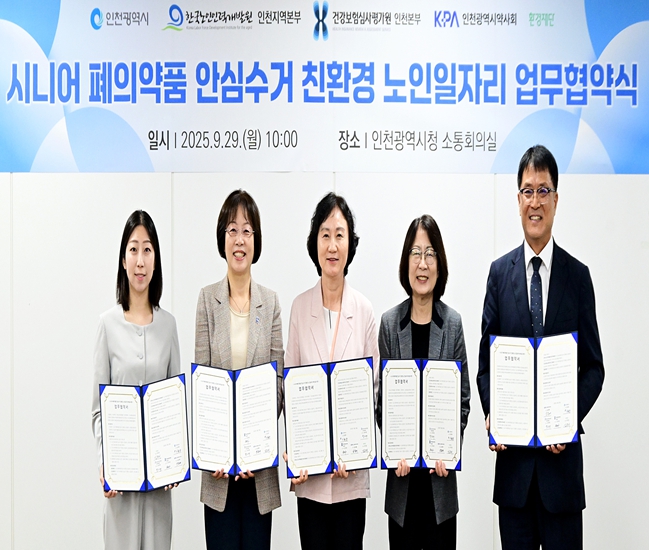 [뉴스앤톡] 인천광역시는 9월 29일 시청 청사에서 건강보험심사평가원 인천본부, 인천시약사회, 환경재단, 한국노인인력개발원 인천본부와 함께‘폐의약품 안심분리수거 노인일자리 확대 업무협약’을 체결했다고 밝혔다.