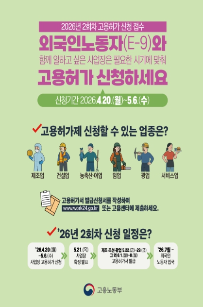 [뉴스앤톡] 고용노동부는 4월 20일부터 5월 6일까지 전국 지방고용노동관서를 통해 2026년도 2회차 외국인노동자(E-9) 신규 고용허가 신청을 받는다고 밝혔다.
