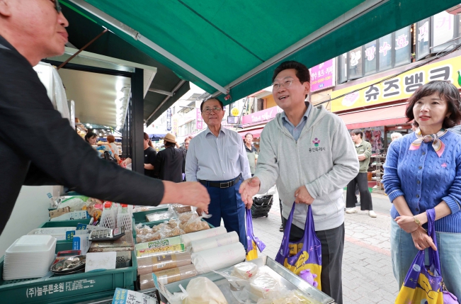 이 시장은 2일 부인 김미영 여사와 용인을 대표하는 전통시장인 ‘용인중앙시장’을 찾아 과일‧고기‧떡‧전 ㆍ빵 등을 구매하고, 상가를 돌며 상인들과 장을 보러나온 시민들과 인샤하고 정담을 나눴다.