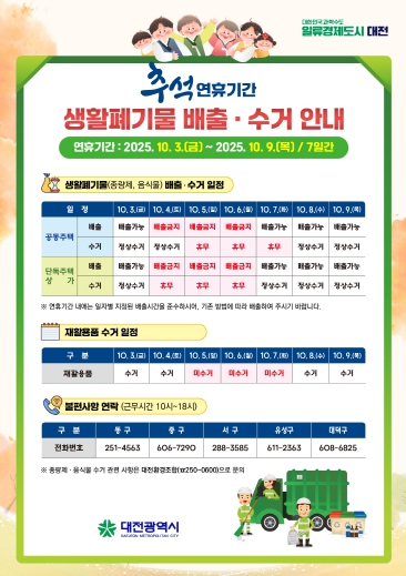 문창용 대전시 환경국장은 “추석 연휴 동안 쓰레기 수거 공백이 발생하지 않도록 철저히 관리하겠다”라며 “시민들께서도 올바른 분리배출과 생활쓰레기 줄이기에 적극 동참해 주시길 바란다”라고 당부했다.