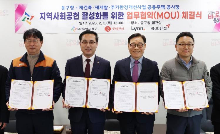 [뉴스앤톡] 대전 동구는 5일 관내 대규모 공동주택 공사 현장의 시공사와 ‘지역사회 공헌 활성화 업무협약’을 체결하고, 지역 안전관리 강화와 상생 협력을 위한 협력 체계를 구축했다고 밝혔다.