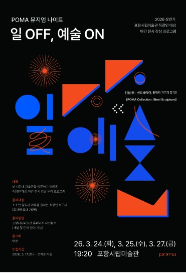 [뉴스앤톡] 포항시립미술관은 오는 24일, 25일, 27일 사흘간 평일 낮 시간대 방문이 어려운 직장인들을 위해 야간 전시 감상 프로그램 ‘POMA 뮤지엄 나이트: 일 OFF, 예술 ON’을 운영한다.