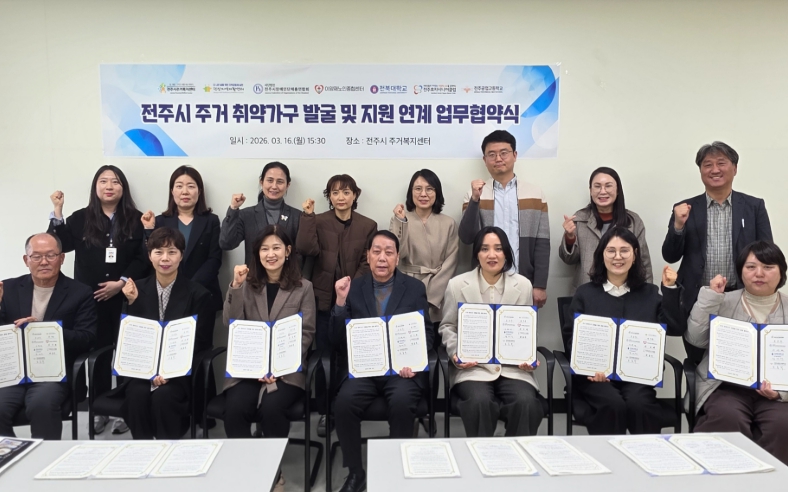전주시 주거복지센터는 16일 센터 회의실에서 덕진지역자활센터 등 6개 유관 기관·단체와 함께 ‘주거 취약 가구 발굴 및 주거 서비스 지원 연계 업무협약’을 체결했다.