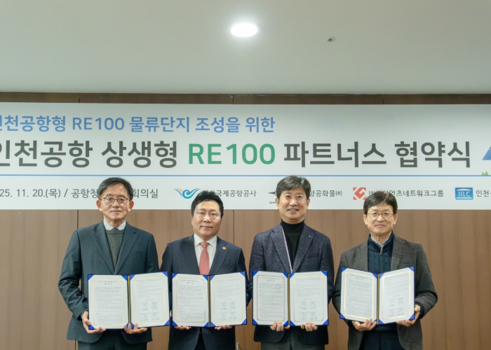 [뉴스앤톡] 인천국제공항공사는 20일 오전 공항청사 회의실에서 물류단지 입주기업 3개社와 함께 ‘상생형 RE100 파트너스 업무협약(MOU)’을 체결했다고 밝혔다.