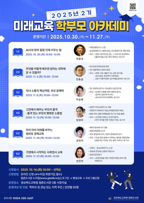 [뉴스앤톡] 경상북도교육청 점촌도서관은 10월 30일부터 11월 27일까지 학부모 및 일반인을 대상으로 2025년 2기'미래교육 학부모 아카데미'를 운영한다.