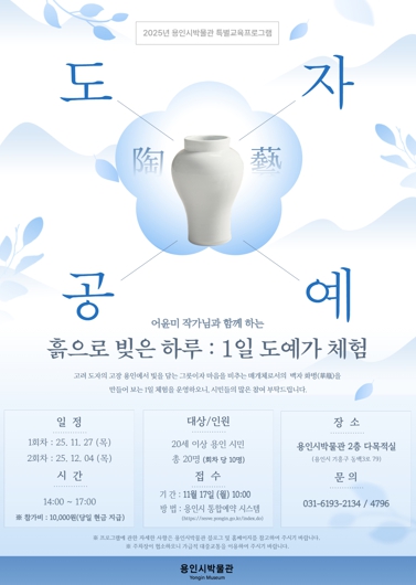 이번 프로그램은 어윤미 작가와 함께 백자 화병을 직접 만들어보는 참여형 교육으로, 흙을 다루며 고려 도자의 빛과 멋을 느낄 수 있는 기회를 제공한다. 참가자들은 흙이 화병으로 빚어지는 과정을 체험하면서 마음을 비우고 집중하는 도예의 매력을 경험하는 시간을 갖게 된다.