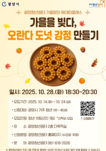 [뉴스앤톡] 광양시는 청년들의 여가문화 활성화와 정서적 힐링을 위한 프로그램의 일환으로, 광양청년꿈터에서 가을맞이 원데이클래스 ‘가을을 빚다 – 오란다 도넛 강정 만들기’ 참가자를 모집한다고 14일 밝혔다.