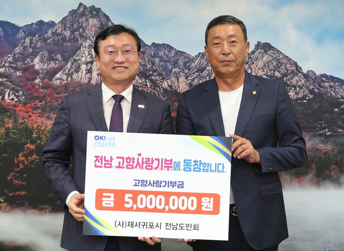 [뉴스앤톡] 전라남도는 (사)재서귀포시 전남도민회가 지난 10일 고향사랑기부금 500만 원을 전남도에 기탁했다고 밝혔다.