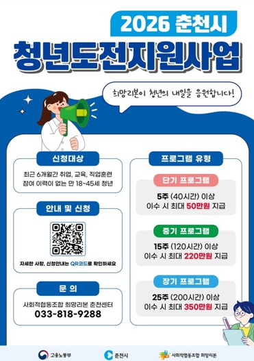 [뉴스앤톡] 춘천시가 ‘2026년 청년도전지원사업’에 참여할 청년 130명을 모집한다.