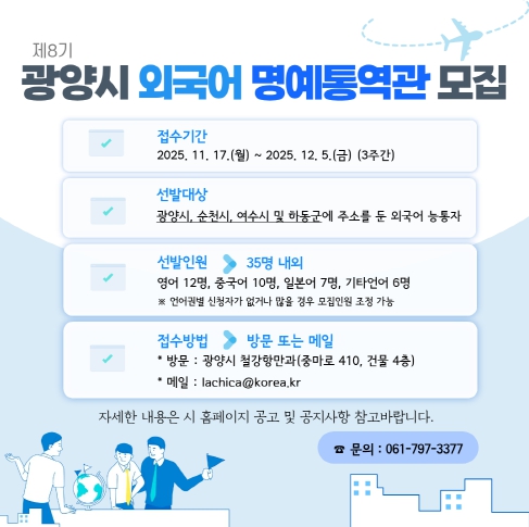 | ▲ 광양시, 국제교류 지원할 ‘제8기 외국어 명예통역관’ 35명 모집 - 철강항만과(명예통역관 모집 카드뉴스) |