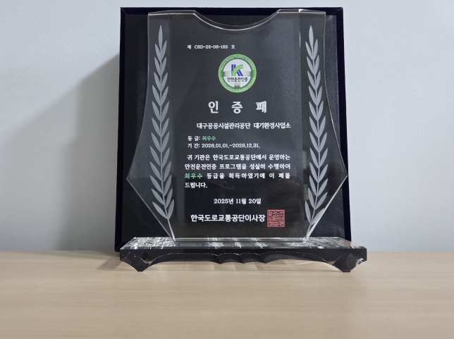[뉴스앤톡] 대구공공시설관리공단(이사장 문기봉) 대기환경사업소는 지난 20일 한국도로교통공단에서 시행된 ‘안전운전인증’ 심의 결과, 11월 26일 최우수 등급으로 인정받았다.