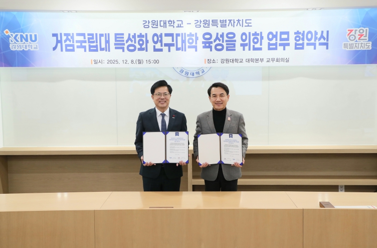 [뉴스앤톡] 강원특별자치도는 12월 8일 강원대학교 대학본부 3층 교무회의실에서 강원대학교와'거점국립대 특성화 연구대학 육성을 위한 업무협약'을 체결했다고 밝혔다.
