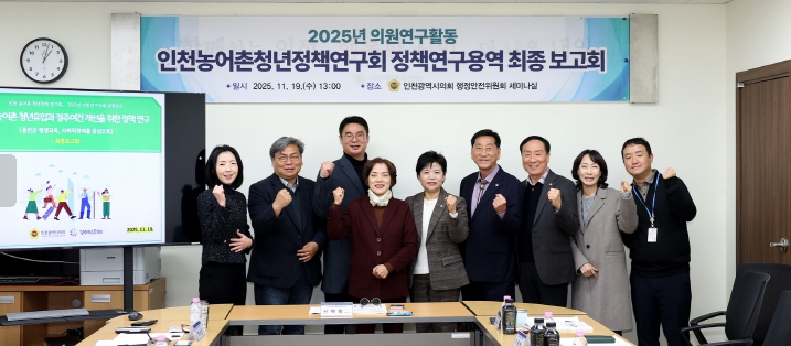 [뉴스앤톡] 인천광역시의회 의원연구단체 ‘인천 농어촌 청년정책 연구회(대표의원 신영희)’가 19일 행정안전위원회 세미나실에서 정책연구용역 최종보고회를 열고, 농어촌·도서 지역의 인구 감소 대응을 위한 평생교육·사회적경제 기반 청년 정착 모델을 발표했다.