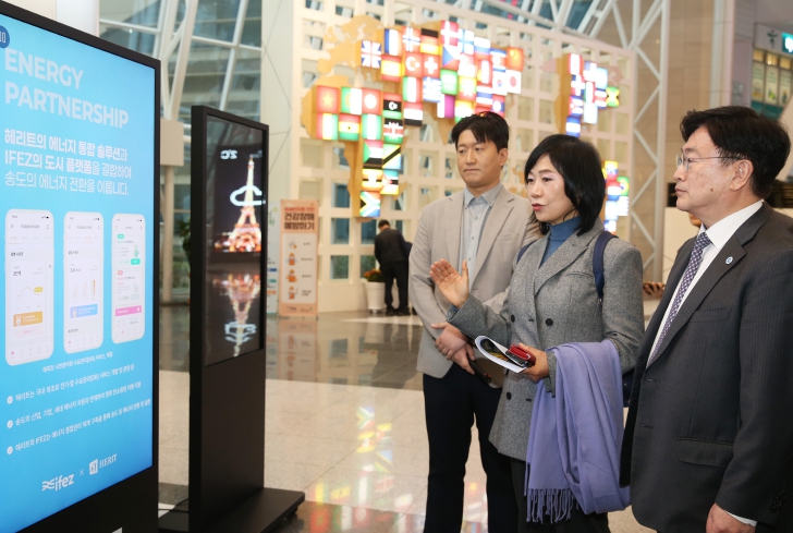 | ▲ 인천경제청은 27일 송도지타워에서 윤원석 인천경제청장, 한민숙 ㈜헤리트 대표 등이 참여한 가운데, IFEZ 제로에너지스마트시티 통합플랫폼 구축사업 시연회를 개최했다. |