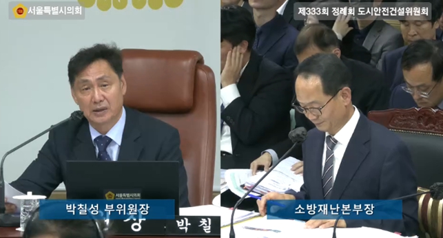 [뉴스앤톡] 서울특별시의회 도시안전건설위원회에서 부위원장으로 의정활동 하고 있는 박칠성 시의원(더불어민주당, 구로4)은 지난 5일 열린 서울특별시의회 제333회 정례회 도시안전건설위원회 소관 소방재난본부 행정사무감사에서 화재안전 사각지대의 문제점을 지적하고 실효성 있는 대책 마련을 촉구했다.