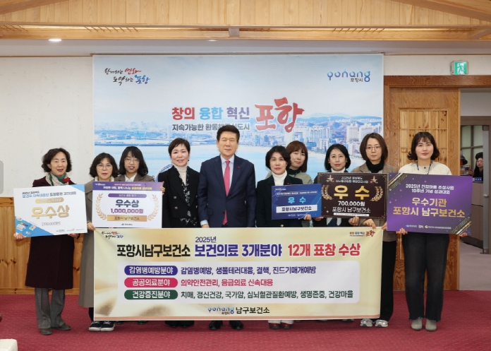 [뉴스앤톡] 포항시 남구보건소가 2025년 한 해 동안 보건의료 전 분야에서 탁월한 성과를 거두며, 중앙부처와 경상북도 평가 등에서 총 3개 분야 12개의 상을 휩쓸었다고 23일 밝혔다.