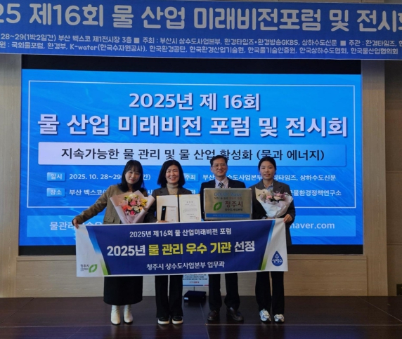 [뉴스앤톡] 청주시 상수도사업본부는 28일 부산 벡스코에서 개최된 ‘제16회 물 산업미래 비전 포럼’에서 ‘물 관리 우수기관’으로 선정돼 상을 받았다.