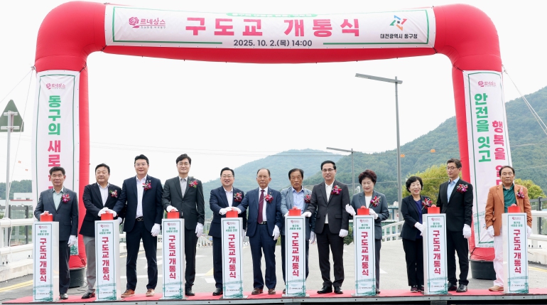 이날 개통식에는 박희조 동구청장, 오관영 동구의회의장, 이장우 대전시장을 비롯한 주요 내빈과 지역 기관·단체장, 주민 등 200여 명이 참석해 새롭게 단장한 구도교의 개통을 함께 축하했다.