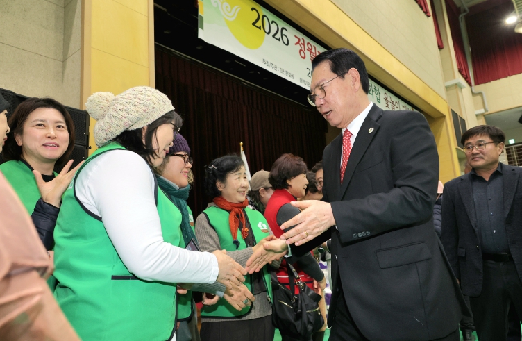 | ▲ 27일 괴산국민체육센터 정월대보름 군민화합 행사에서 송인헌 괴산군수가 군민들과 인사를 나누고 있다. |