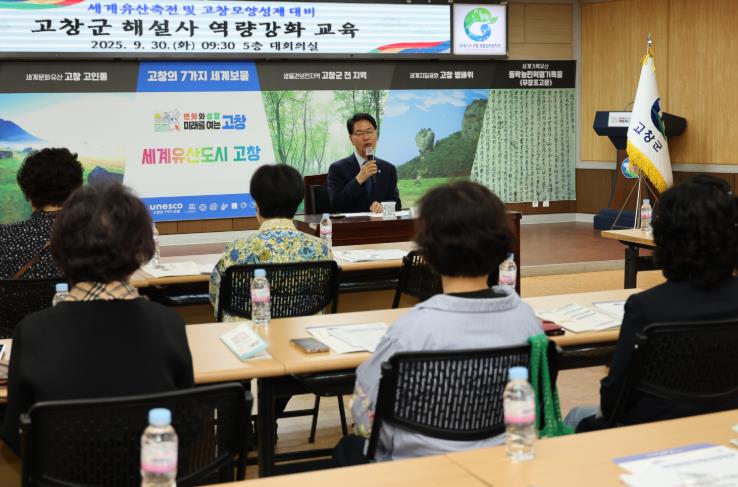 [뉴스앤톡] 고창군이 30일 군청 5층 회의실에서 ‘2025 세계유산축전(10월2~22일)’과 ‘제52회 고창모양성제(10월29일~11월2일)’를 앞두고 해설사 친절교육을 실시했다.