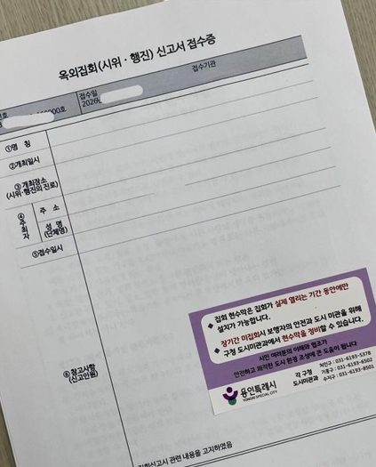 | ▲ 용인특례시의 옥외집회 신고서 접수증 |