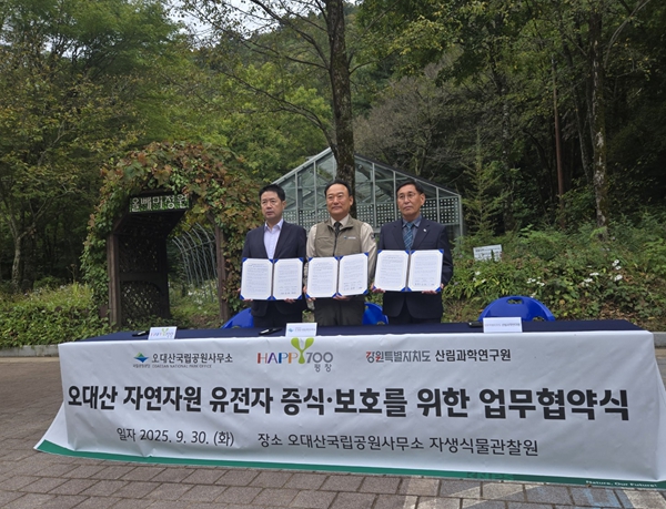 [뉴스앤톡] 강원특별자치도 산림과학연구원은 9월 30일 국립공원공단 오대산국립공원사무소, 평창군과 우수 산림 유전자원 보존을 위한 업무협약을 체결하고, 오대산국립공원 내 보호수로 지정된 잎갈나무의 후계목을 육성하고 있다고 밝혔다.