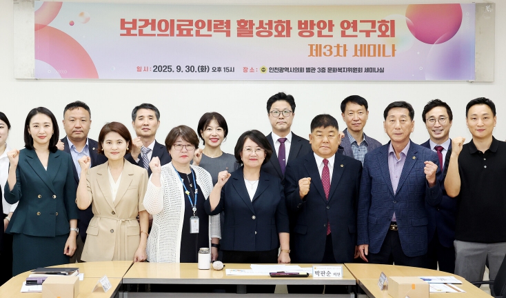 [뉴스앤톡] 인천광역시의회 의원연구단체인 ‘보건의료인력 활성화 방안 연구회’는 30일 문화복지위원회 세미나실에서 박판순 대표의원(국·비례)을 비롯해 박창호(국·비례)·이봉락(국·미추홀구3) 의원, ‘의료기사단체 정책연구단’관계자 등이 참석한 가운데 ‘제3차 정책 세미나’를 개최했다.