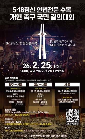 광주광역시(시장 강기정)는 전국 시민사회단체, 종교계, 오월단체, 광주시, 전남도 등으로 구성된 ‘5·18 헌법전문 수록 개헌 국민추진위원회’(이하 추진위원회)가 오는 25일 오후 2시 국회 의원회관 2층 대회의실에서 ‘5·18정신 헌법전문 수록 개헌 촉구 국민결의대회’를 개최한다고 4일 밝혔다.
