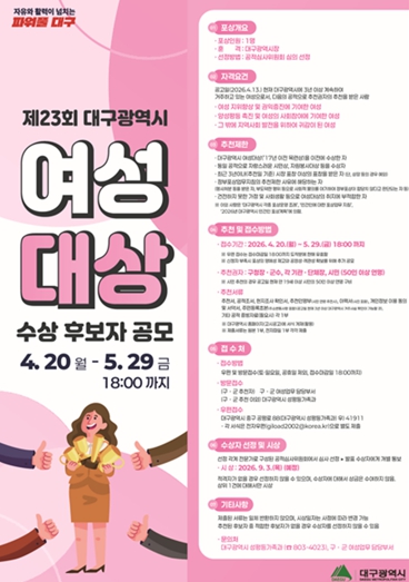 [뉴스앤톡] 대구광역시는 여성의 지위 향상과 양성평등 실현에 공헌한 여성 인재를 발굴·격려하기 위해 ‘2026년 제23회 대구광역시 여성대상’ 수상 후보자를 4월 20일부터 5월 29일까지 공개 모집한다.
