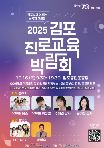 시는 오는 16일 오전 9시 30분부터 오후 7시 30분까지 김포종합운동장에서 ‘2025 김포 진로교육 박람회’를 개최한다고 밝혔다. ‘김포시가 이끄는 교육의 첫걸음’을 주제로 열리는 이번 박람회는 인공지능, 로봇공학, 스마트 모빌리티 등 미래산업분야를 포함해 100여 개의 부스를 마련했다. 다양한 진로 탐색부터 진로진학지도 방향 제시까지 아우르는 것이 특징이다.