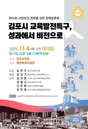 [뉴스앤톡] 김포시의회는 김포시 교육발전특구의 추진 성과를 점검하고 향후 비전과 정책 방향을 모색하기 위해 오는 11월 4일 장기도서관 3층 다목적강당에서 정책토론회를 개최한다.