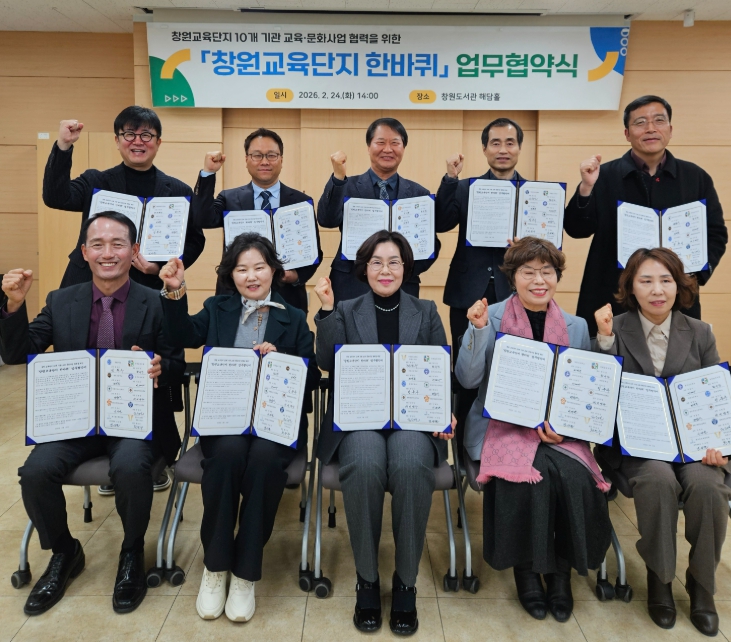 황둘숙 창원도서관장을 비롯한 10개 기관장들은 “이번 협약은 기관 간의 담장을 허물고 아이들의 배움이 단지 내 어디서든 이어질 수 있도록 하는 기관장들의 뜻을 담은 첫 발걸음”이라며, “앞으로 창원교육단지가 새로운 교육공동체 협력 모델이 될 수 있도록 10개 기관이 한마음으로 협력해 나가겠다”라고 밝혔다.