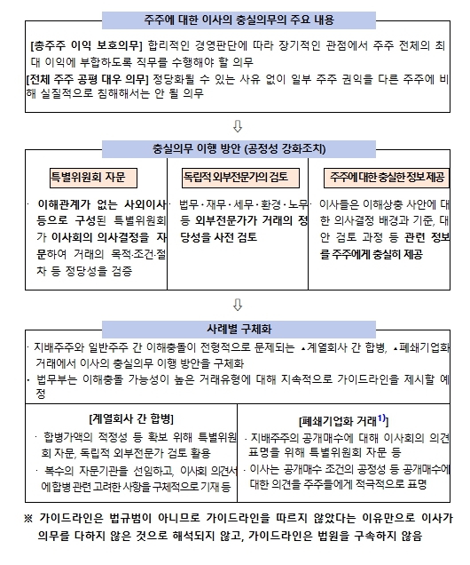 충실의무 이행방안에는 첫째, 이해관계가 없는 사외이사 등으로 구성된 ‘특별위원회’가 이사회 의사결정을 자문하는 방안, 둘째, 법무·재무·세무·환경 등 외부전문가가 거래의 정당성을 사전 검토하는 방안, 셋째, 이해상충 사안에 대한 이사의 의사결정 배경과 기준 등 관련 정보를 주주에게 충실히 제공하는 방안 등이 포함된다.