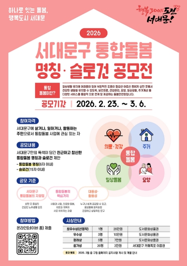 희망자는 서대문구청 홈페이지 공지사항을 참고해 서대문구만의 특색이 담긴 친근하고 참신한 6자 이내의 ‘통합돌봄’ 명칭과 15자 이내의 ‘슬로건’을 3월 6일까지 제출하면 된다.
