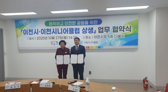 [뉴스앤톡] 이천시는 10월 27일 이천시니어클럽과 ‘쾌적하고 안전한 공원을 위한 상생 업무협약(MOU)’을 체결했다. 이번 협약은 공원 환경정화와 안전관리 강화를 위해 민관이 협력체계를 구축하고, 어르신의 사회참여와 일자리 확대를 지원하기 위해 추진됐다.