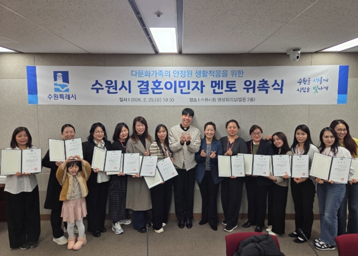 [뉴스앤톡] 수원특례시가 25일 시청 영상회의실에서 ‘2026년 결혼이민자 멘토 위촉식’을 열고 선배 이민자 멘토 15명을 위촉했다.