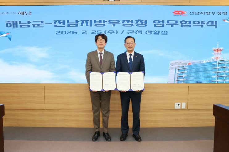 [뉴스앤톡] 전남지방우정청(청장 김동주)은 25일 해남군청에서 해남군(군수 명현관)과 지역 농·수·축산물 판로 확대를 위한 업무 협약을 체결했다고 밝혔다.